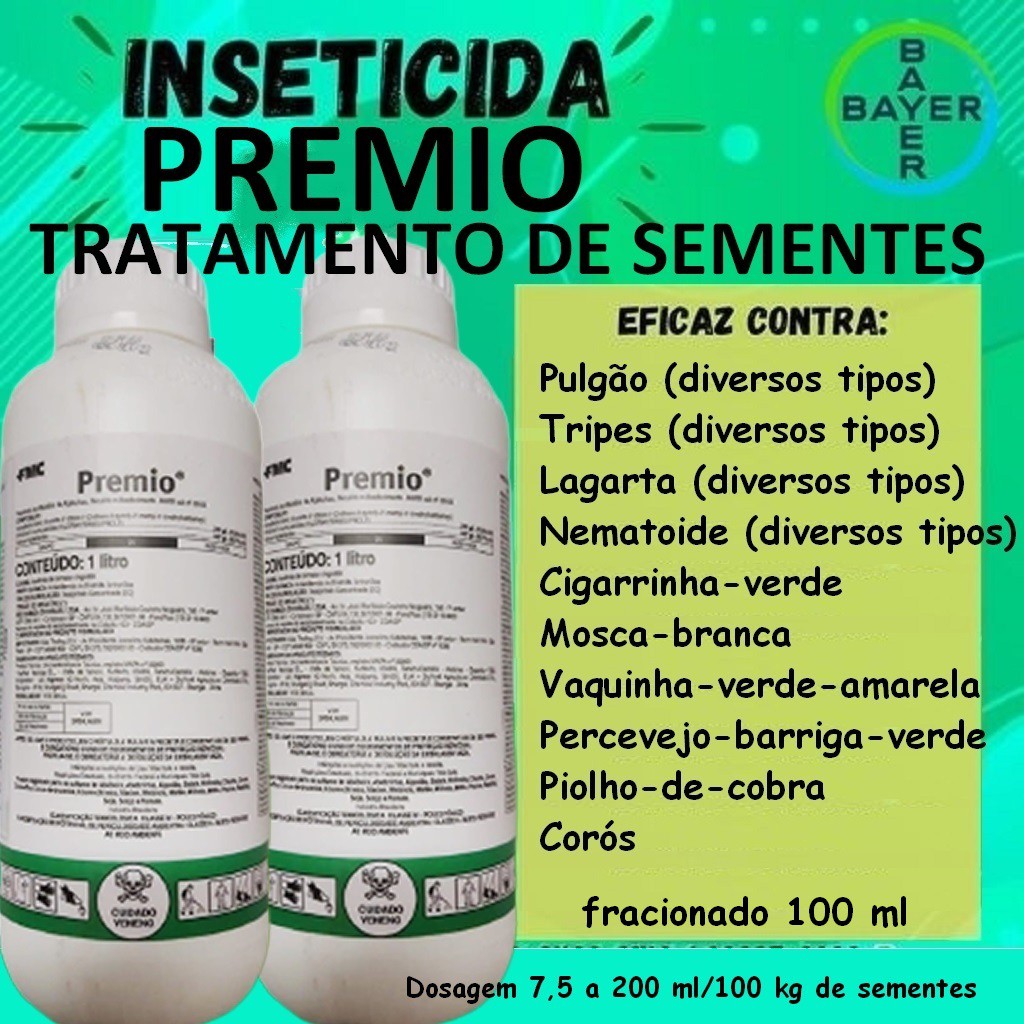 O inseticida Premio® pertencem ao grupo químico das diamidas antranílicas atuando por contato e ingestão . indicado para o tratamento de sementes O inseticida Premio® é seletivo para as culturas da abóbora, abobrinha, algodão, amendoim, aveia, batata, batata-doce, berinjela, beterraba, brócolis, cenoura, centeio, cevada, chuchu, couve, couve-flor, couve-debruxelas, couve-chinesa, duboisia, ervilha, feijão, feijões, grão-de-bico, jiló, lentilha, mandioca, mandioquinha,salsa, maxixe, melancia, melão, milheto, milho, pepino, pimenta, pimentão, quiabo, repolho, soja, sorgo, tomate, trigo e triticale.